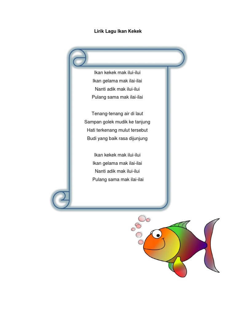 Jana Wada Zaza adalah lagu kanak-kanak khas buat anak-anak berumur 2-6 tahun. Ikan Kekek is about a fish and a whole lot more. Lirik Lagu Ikan Kekek - Dodoi Si Manja Ikan kekek mak ilui-ilui Ikan gelama mak ilai-ilai Nanti adik mak ilui-ilui Pulang sama mak ilai-ilai Tenang-tenang air di laut Sampan golek mudik ke tanjung Hati terkenang mulut tersebut Budi yang baik rasa dijunjung.